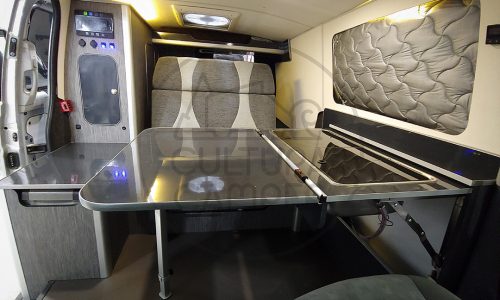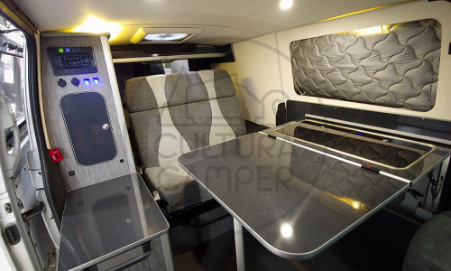 Por otro lado, era preciso espacio en el comedor para guardar su bici de montaña a la hora de dormir. Así pues, esta Mercedes Vito es la primera van en la que instalamos un mueble con cocina y fregadero abatible que cuando se plega deja lugar a un amplio salón.